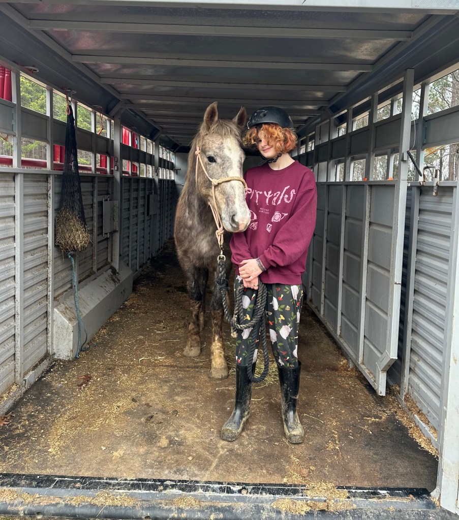 Ella finished the work with her first horse, Bones. They have a series of steps to go through to be finished – the first being just being in the ring with the horse, to being able to touch the horse, to putting a halter on… ending with you being able to lead the horse into a trailer. Look how calm he is with her! He was a wild mustang when she started.