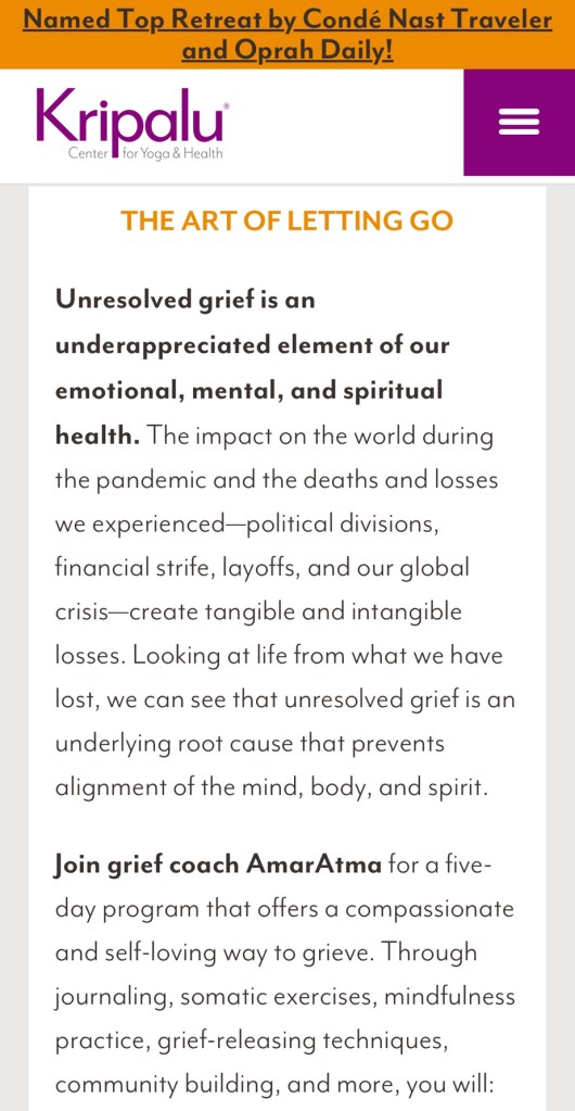 My therapist noted that I have been going through grief for about 20 years now. Starting with our infertility journey when we turned 30. That’s a lot to carry around. So I decided to do something good for my soul. I am about to embark on a “Coping with Grief” retreat at a yoga and wellness center in MA. It starts tonight! So symbolic on the one year anniversary of my surgery.