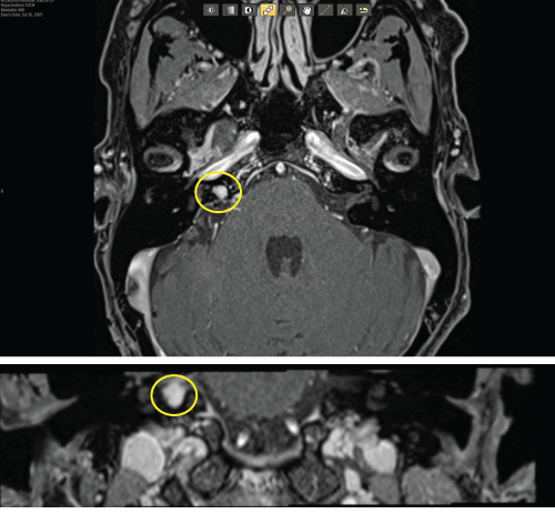 Hello friends. I haven’t posted in a while, but my (and Ella’s – now “Ace”) journey is not over, unfortunately. I had an MRI in July and it is showing some regrowth. It is small – like the size of a pea, but I need to address it. You can see it in these scans. That little white dot on the left side of the image is the regrowth. It’s definitely different than the other side. They are recommending a procedure called gamma knife.